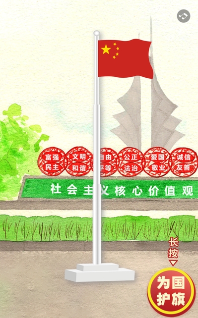 早上8点整,参加线上升旗仪式的师生在家穿戴整齐,通过网络进入“我为祖国升国旗” H5活动界面,面向屏幕中的国旗肃立,行注目礼;伴随着《义勇军进行曲》的响起,师生们长按“为国护旗”按钮,高唱国歌,亲手升起五星红旗!别样的升旗仪式点燃了师生抗击疫情的决胜信心和浓浓的爱国爱校情怀。