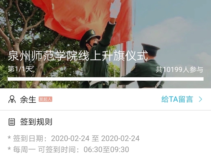 开学延迟,对祖国的爱不延迟。2月24日早上,校团委利用网络组织师生“线上集结”,举行一场以“青春战‘疫’,祝福祖国”为主题的特殊而又庄严的升旗仪式,全校团干部、辅导员、学生等近11000名师生参加。他们跨过疫情和时空的阻隔,致敬亲爱的祖国,致敬英雄的城市,致敬前方的医生,致敬勇敢的人民,致敬伟大的时代!
