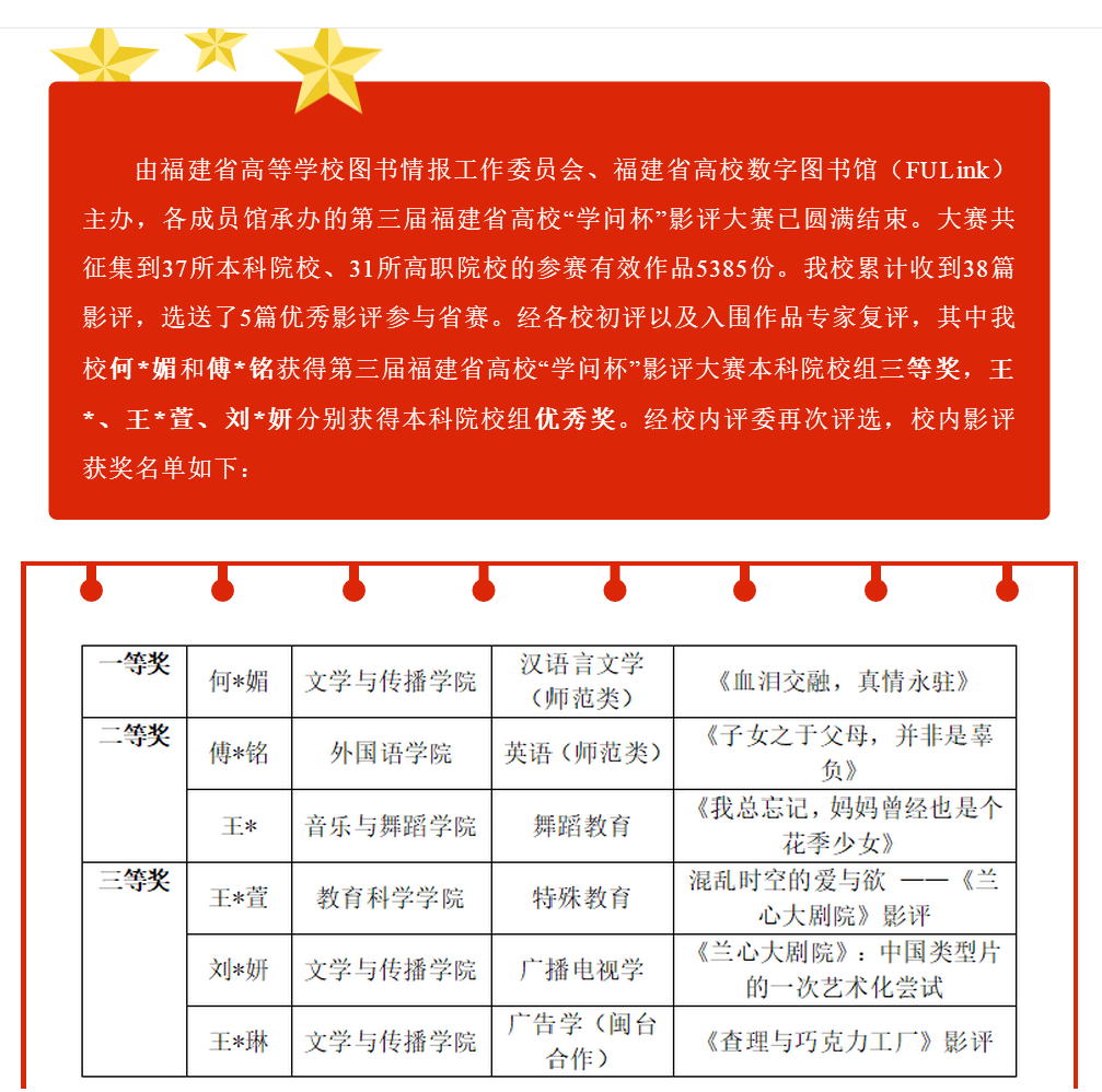 今年我们协助校图书馆顺利开展第三届福建省“学问杯”影评大赛。在明确比赛相关片目后,立即组织观影,在“英国威廉希尔公司官网图书馆”公众号上发布推文,并同步发布至协会QQ群进行活动推广,收集同学们的影评后核对相关信息。在影评比赛结束后,联系获奖同学并在公众号上公示获奖名单。