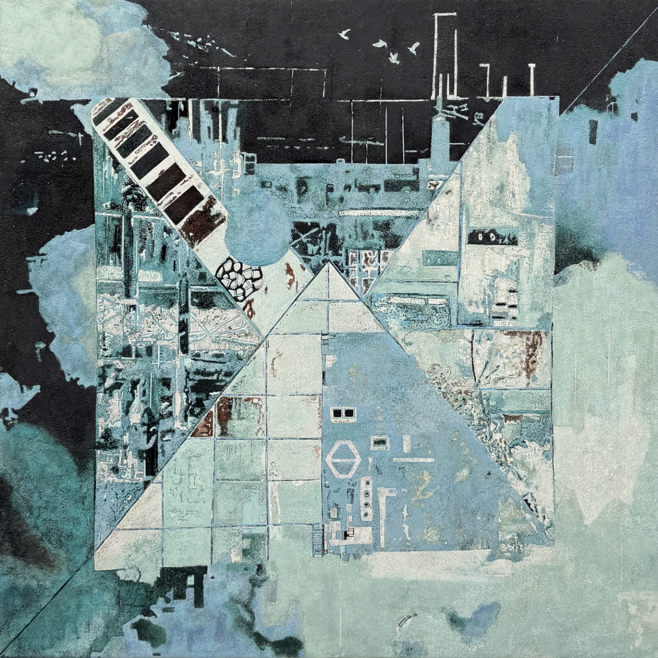 漆画作品《战后筑新・共护和平》充分发挥天然大漆的艺术表现力,以精准的形式语言构建起厚重而鲜活的视觉叙事。作品融合了几何色块的锐利轮廓与蓝绿漆层叠晕的温润肌理,并辅以漆粉、箔料、螺钿、蛋壳等材料的质感碰撞生成强烈视觉张力,表达废墟之上人类以理性秩序共同搭建与守护新的未来,诠释了“战后重建”与“守卫和平”的主题。画面中以稳固的三角形和矩形结构相互穿插、支撑,形成一种“构筑”的态势,直抵“破而后立,共护和平”的精神内核。