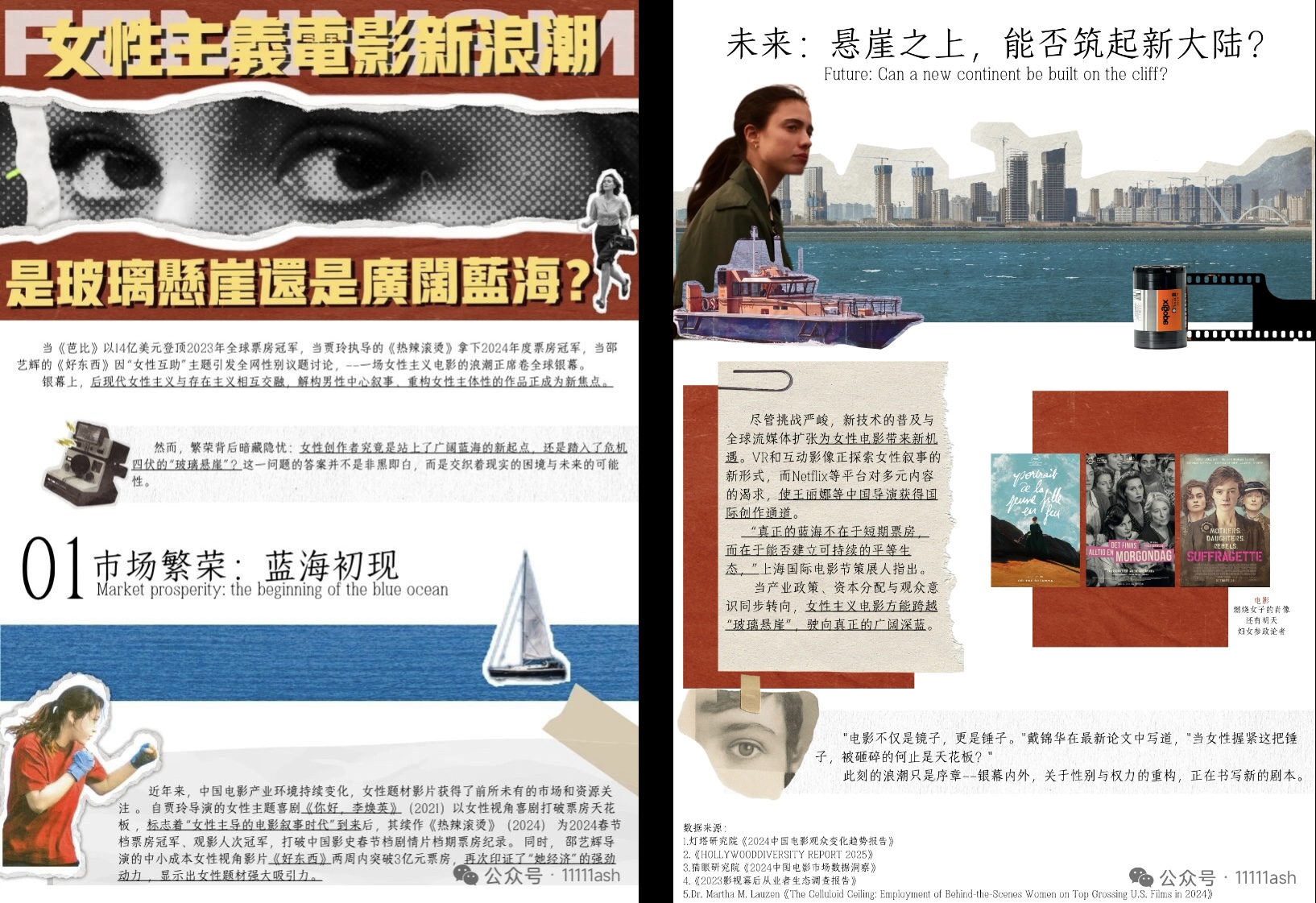 作品通过新颖的版面设计,将电影视觉语言与平面设计相结合,用隐喻性的视觉元素呈现了“玻璃悬崖”与“广阔蓝海”的双重隐喻探讨了当代女性主义电影在商业与艺术之间的定位困境与机遇。在创作过程中,指导老师兼带队老师吴孟轩引导学生深入调研女性主义电影发展现状,分析国内外相关报道的视觉呈现方式,并鼓励学生在尊重事实的基础上进行创新表达。