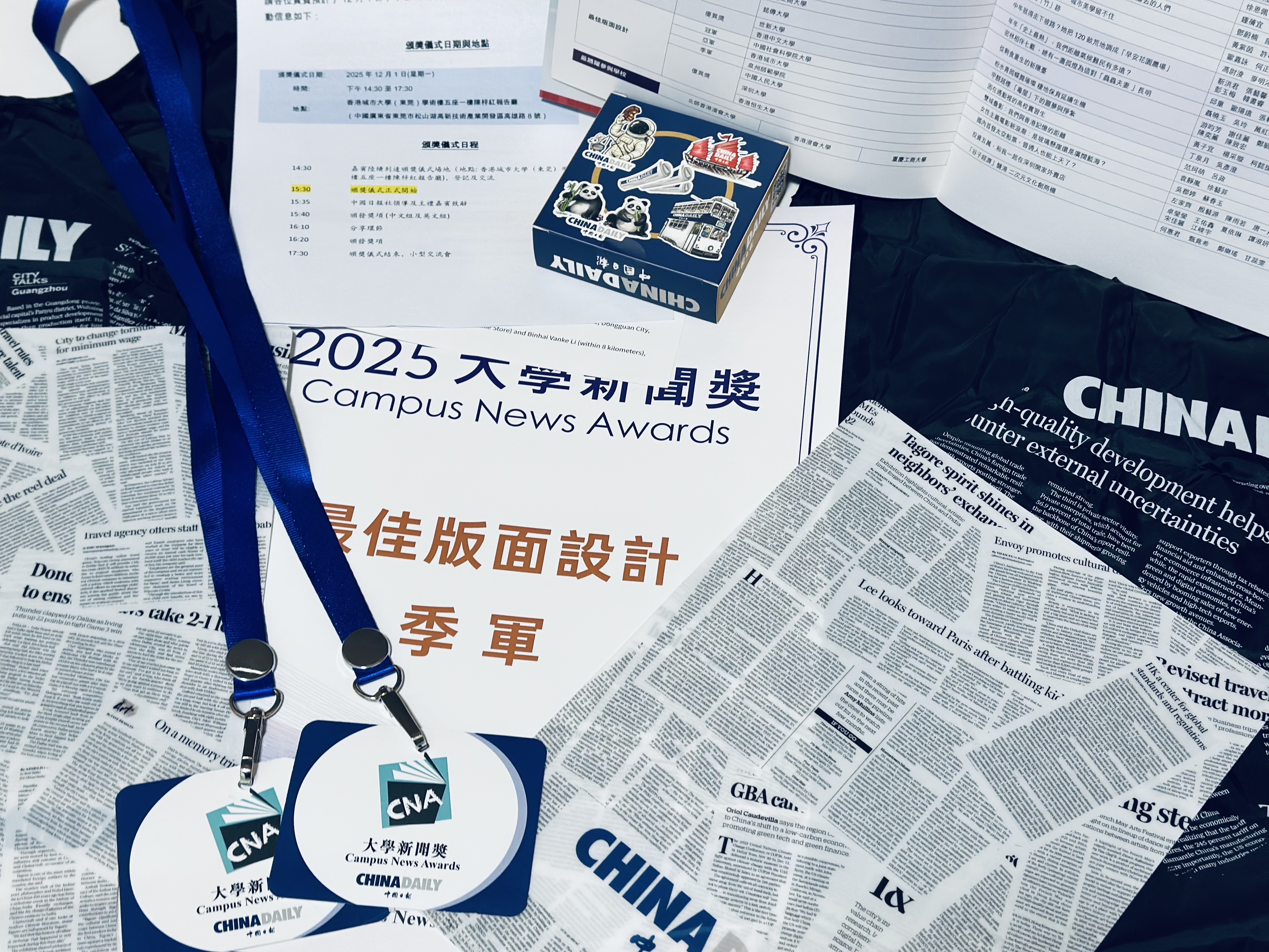 12月1日,中国日报主办的“2025年大学新闻奖”颁奖典礼在香港城市大学东莞校区举行。我校文学与传播学院23级广告学(闽台合作)专业的吴郡婷、苏春玉同学的作品《女性主义电影新浪潮:是玻璃悬崖还是广阔蓝海?》荣获最佳版面设计季军。