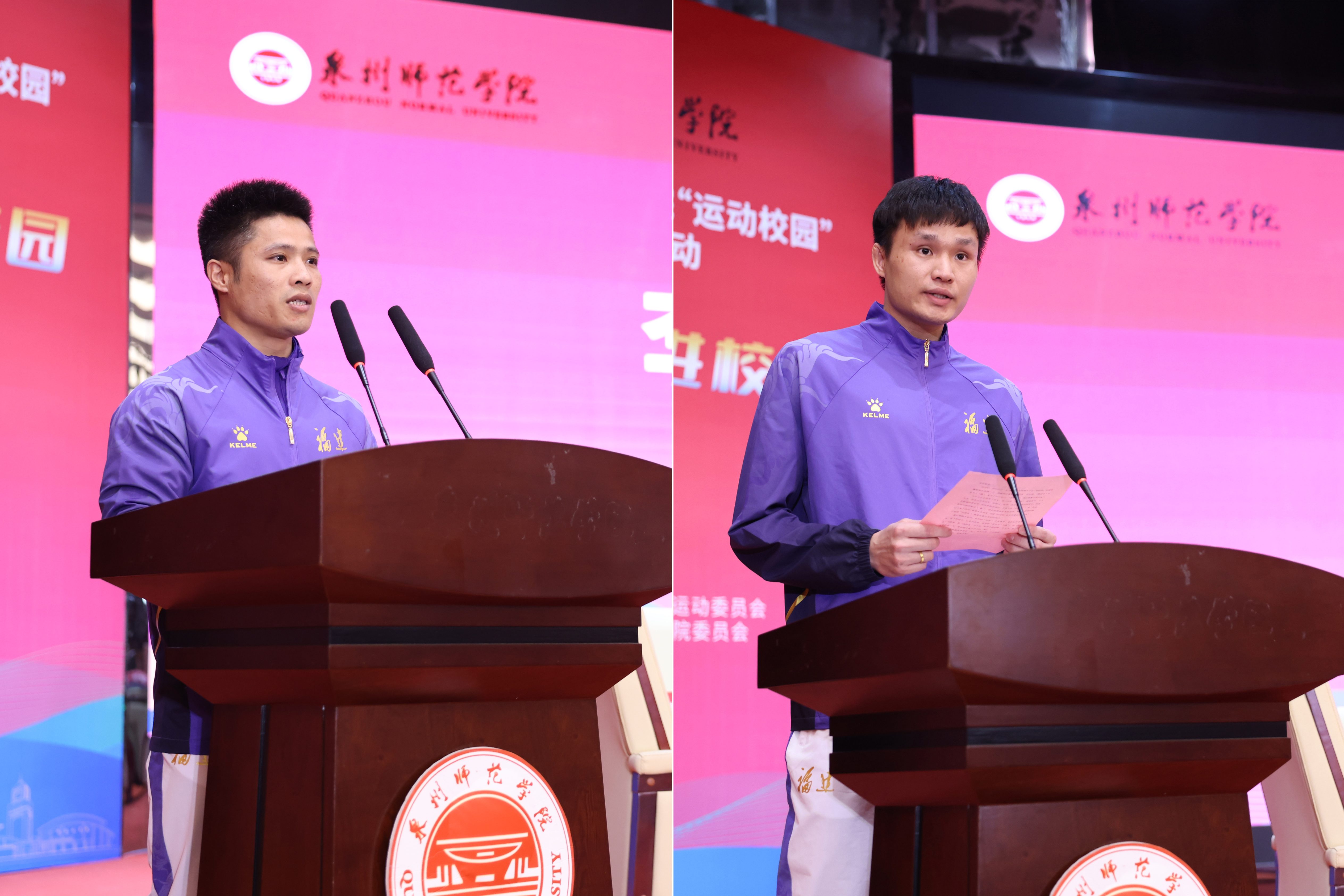 在分享环节,举重奥运冠军李发彬结合自身二十余年运动生涯,分享了与泉师“善学如泉 正心至大”校训同频共振的成长历程。他说,从体校基础训练到全运会三连冠,“善学”让他不断精进技术,“正心”让他在伤病与挫折中坚守为国争光的初心。击剑运动员陈海威以“以剑为炬”为题,讲述了自己从队里“最笨的那个”到世界冠军的逆袭之路,用“笨功夫攒底气”“与放弃较劲”的经历,诠释了体育精神的真谛。