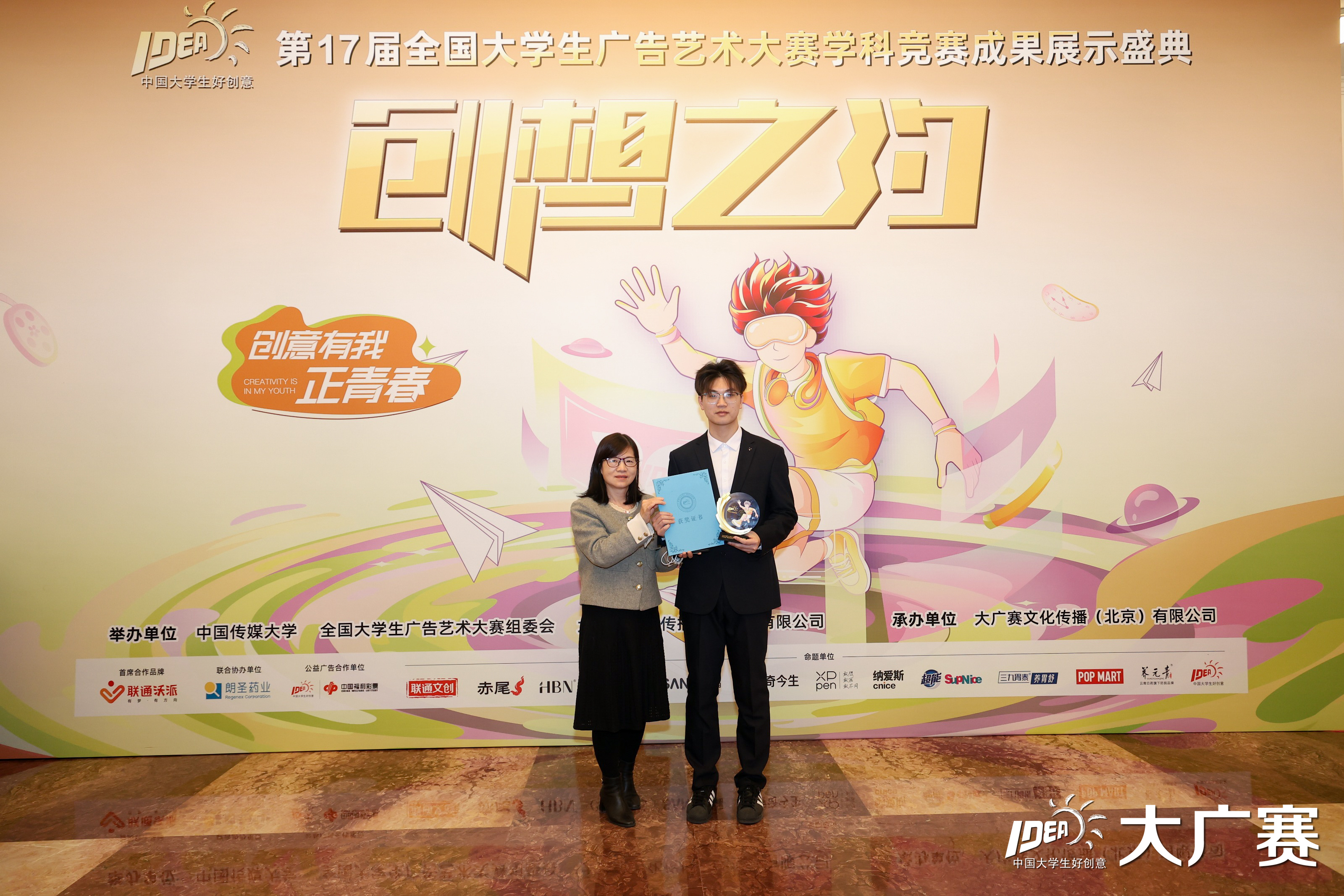 近日,第十七届全国大学生广告艺术大赛学科竞赛成果展示盛典暨20周年华彩盛典在北京全国政协礼堂举办。我校文学与传播学院广告学(闽台合作)专业阮榆琪、戴梓杰同学的作品《喂?胃!——三九胃泰牌养胃舒》(指导老师:李玉秀),荣获广播类全国二等奖。