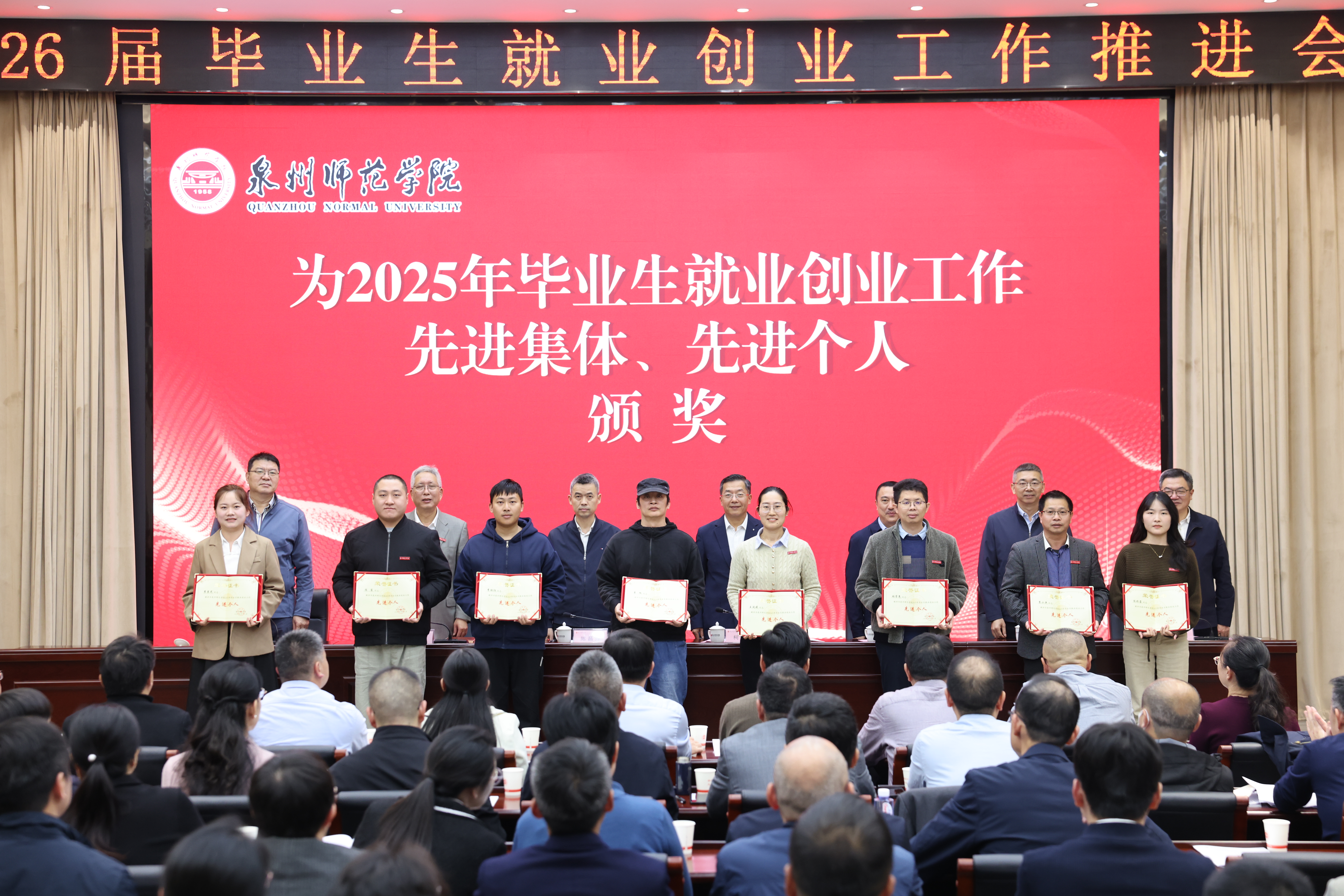 12月17日下午,我校在中山纪念堂第一会议室召开2026届毕业生就业创业工作推进会。全体校领导,机关各部门负责人,各二级学院(系)书记、院长(主任)、副书记、学工办负责人以及受表彰的2025年毕业生就业创业工作先进个人参加会议。会议由副校长夏侯建兵主持。