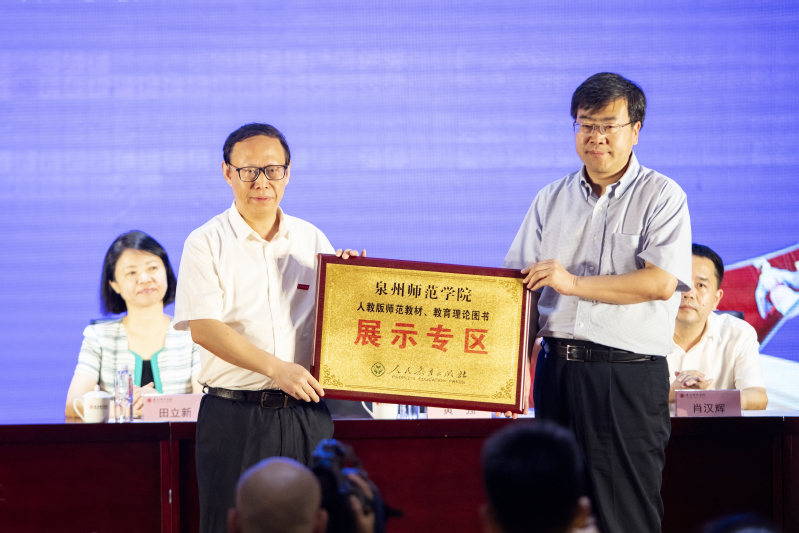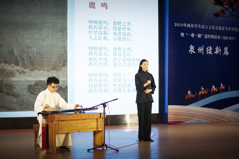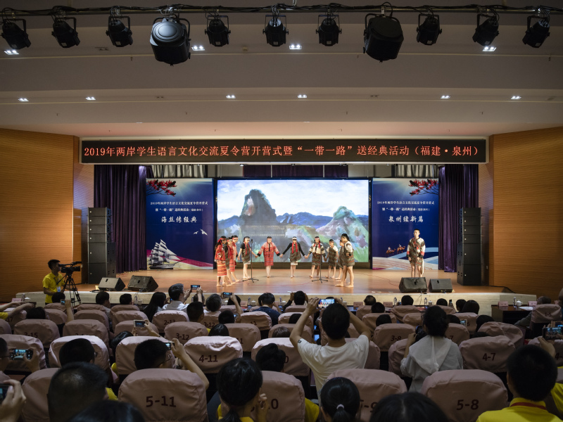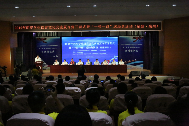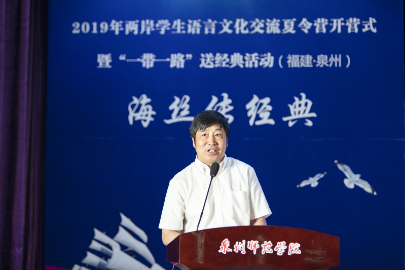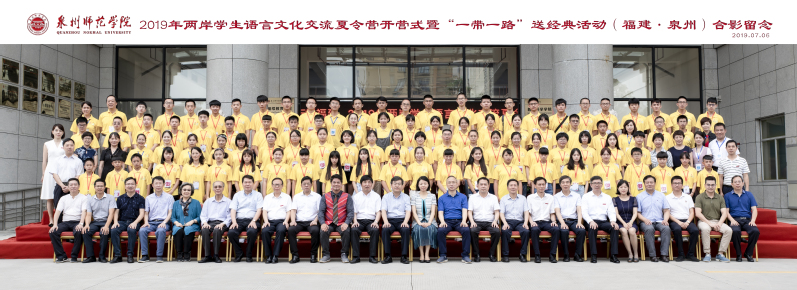 On the morning of July 6th, the Opening Ceremony of 2019 Language & Culture Communication Summer Camp for Students on Both Sides of the Taiwan Straits and “The Belt and Road” Chinese Classics Donation Ceremony were held in No.1 Academic Hall of Special Education Block in Quanzhou Normal University. More than 300 people attended the activity, including Tian Lixin, Director of Department of Language Application & Administration and Department of Language Information Management of the Ministry of Education, Li Xun, Deputy Director of Education Department of Fujian Province, Xiao Hanhui, Vice-Mayor of Quanzhou Municipal Government, Huang Qiang, Party Secretary and Director of People's Education Press, Fang Ming, General Counsel of  Chinese Classics Database, Broadcasting Instructor of China Media Group and a famous recital artist, Zhu Shize, Party Secretary of QNU, Qu Guangqing, President of QNU, officials from Department of Language Application & Administration and Department of Language Information Management, Work Committee for Taiwan and Overseas Chinese of the Standing Committee of Fujian Provincial People's Congress, Education Department of Fujian Province, People's Education Press, Quanzhou Municipal Government, Straits Publishing & Distributing Group of Fujian Province, Quanzhou Education Bureau, heads of the relevant functional departments of QNU, and teachers and students of the summer camp. The opening ceremony was hosted by Huang Jiangkun, Vice President of QNU.