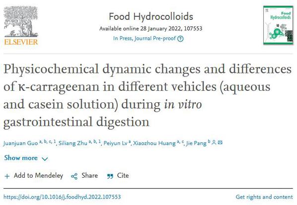 Recently, Food Hydrocolloids (IF: 9.15, the Q1 of the Chinese Academy of Sciences, TOP Journal), a top international journal in the field of food science and technology, published online the latest research results of A/Prof. Guo Juanjuan, a member of the food science and engineering team at the School of Ocean and Food Science, QNU. The title of the paper is Physicochemical Dynamic Changes and Differences of K-Carrageenan in Different Vehicles (Aqueous and Casein Solution) During in Vitro Gastrointestinal Digestion. QNU is the first author affiliation. Zhu Siliang, a joint training master student, is the co-first author of the paper, and Professor Pang Jie with Fujian Agriculture and Forestry University is the corresponding author. The research was supported by National Natural Science Foundation of China (Grant No. 32001625), National Natural Science Foundation of China (Grant No. 41706139), Provincial Natural Science Foundation of Fujian (Grant No. 2020J05159) and Brain Gaining and Scientific Research Starting-up of Quanzhou Normal University (Grant No. H19007).