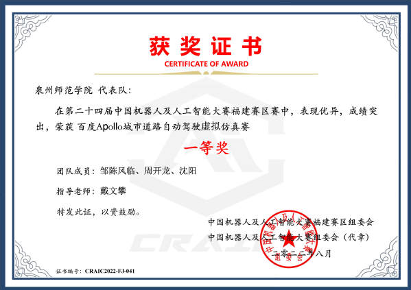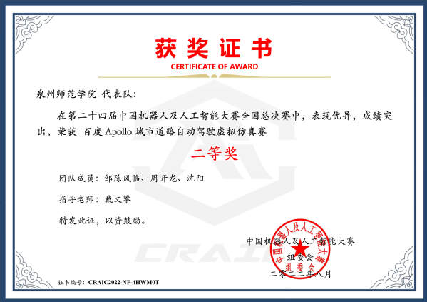 The national final for the 24th China Robot and Artificial Intelligence Competition (CRAIC) kicked off on Aug. 19, 2022. After winning the first prize in the qualifier for the national competition held in Fujian from Jul. 15 to 16, 2022, Team QNU (instructed by Dai Wenpan, with members of Zou Chenfenglin, Zhou Kailong, and Shen Yang) consisting of students of Automobile Service Engineering Major from College of Transportation and Navigation successfully reached the final and won the second prize in “Baidu Apollo Urban Road Autopilot Virtual Simulation Program”. It was the best result ever achieved by students from the universities in Fujian Province.