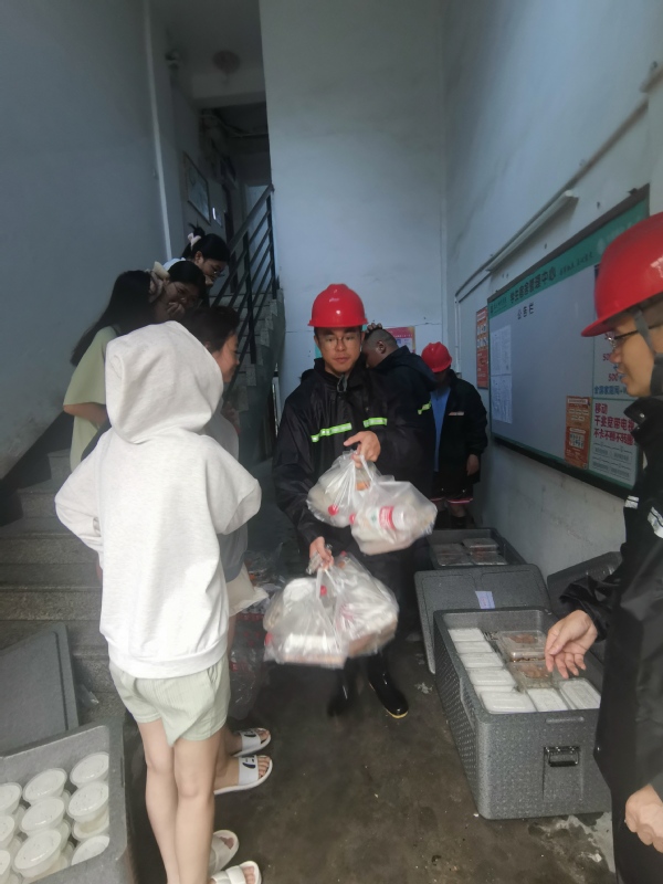 党员突击队打头阵。机关党委牵头组建“党员突击队”,党员亮身份、当先锋,服从统一调度,奔赴抢险救灾最需要的地方。狂风暴雨造成校园内树木倒伏,路面积水,党员突击队队员们全力出动,迅速赶往现场,及时协助清除路面障碍,疏通路面积水,确保校园主干道的正常通行。突击队队员们化身“外卖小哥”,无惧风雨,深入一线,在注意自身安全的同时,奔波于学生宿舍楼之间,确保622名暑期留校的学生能准时吃上可口的饭菜,并及时叮嘱留校学生做好安全防范台风工作。