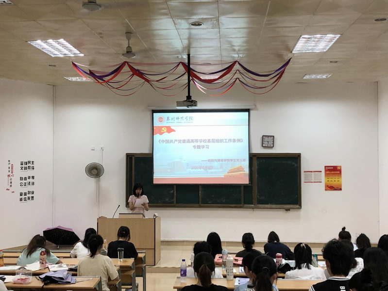 聂莹老师首先从《中国共产党普通高等学校基层组织工作条例》和《中国共产党基层组织选举工作条例》的条例意义、条例内容和基层组织建设等方面出发,对两份条例进行了详细解读,要求支部学生党员要加强思想政治引领,在组织内外发挥学生党员的先锋模范作用。然后,聂莹老师介绍了党内选举制度的内容和意义,引导支部学生党员充分认识党内选举制度在党内法规制度体系中的重要地位,对规范我院学生党支部组织选举、增强我院学生党支部政治能力和组织能力具有重要意义。最后,支部学生党员发表学习感言,表示将继续深入学习条例,并坚决贯彻落实条例内容,以更高的标准的要求自己,充分发挥党员先锋模范作用。