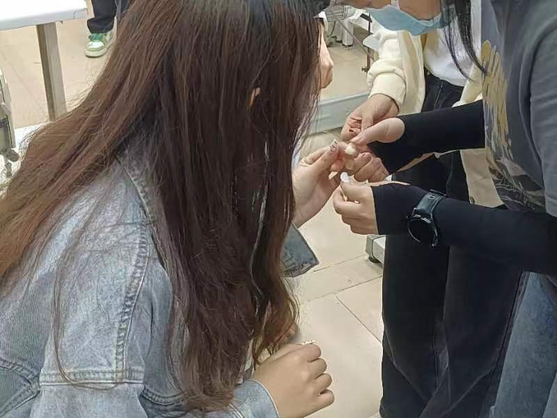 事故现场危险紧急。先有2位学生缝纫机机针戳伤学生食指,此刻同班其他学生听到呼救声后,立即通知任课教师张艳,学生立即到就近的应急柜内取消毒药品、包扎绷带等材料,给受伤的学生先用碘伏棉球消毒受伤部位,再用创可贴对受伤手部进行包扎。不久,有学生手指被缝纫机针扎穿,学生尖叫喊痛、面部紧张、不能动弹,现场老师也束手无策,学生来围观,有同学来安慰、还有的同学帮助处理,有个电话求助实验室管理教师陈艳秋。最后,经过现场老师的安慰和同学的帮助下,先把缝纫机的转盘用手慢慢的倒推,机针逐步离开手指头,手指马上流血。现场学生马上帮助处理伤口,通过快、准手法用碘伏消毒棉球轻轻地对受伤学生的手指进行清洗消毒,便用绷带对其进行牢固包扎后,立即将受伤学生送到医院进行进一步检查。