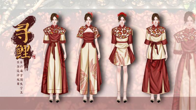 作品《寻鲤的创作贯彻弘扬传统非遗,推动旅游发展的设计理念,参赛作品结合了旅游集章打卡、金苍绣、惠安女服装等元素,让游客在服装上体验集章打卡方式的同时,又能感受泉州景点特色以及非物质文化遗产的魅力