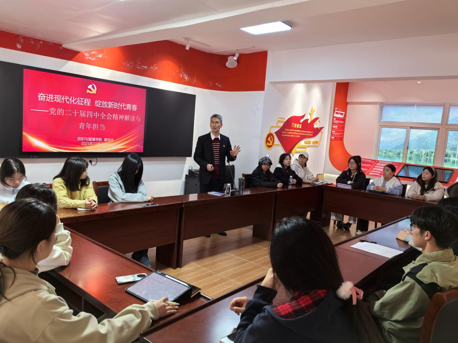 为深入学习宣传贯彻党的二十届四中全会精神,增强基层党组织政治功能和组织功能,11月20日下午,纺织与服装学院党委书记黄国波到学生公寓C区一站式文明实践中心开展党的二十届四中全会精神宣讲活动。学院入党积极分子“学习贯彻党的二十届四中全会精神”培训班暨“青年马克思主义者培养工程”大学生骨干培训班全体学员参加。培训班班主任王亚明参加活动。