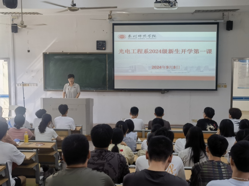 为了帮助和引导新生扣好大学的第一粒扣子,迈好人生的新台阶,树立人生新目标,开启人生新征程,2024年9月8日上午,光电工程系在千墅501为全体2024级光电专业新生举办开学第一课,光电工程系系主任余燕忠,党总支书记林蕙琼,专业主任段亚凡、辅导员柯世池和班主任渠彪参加,活动由林蕙琼主持。