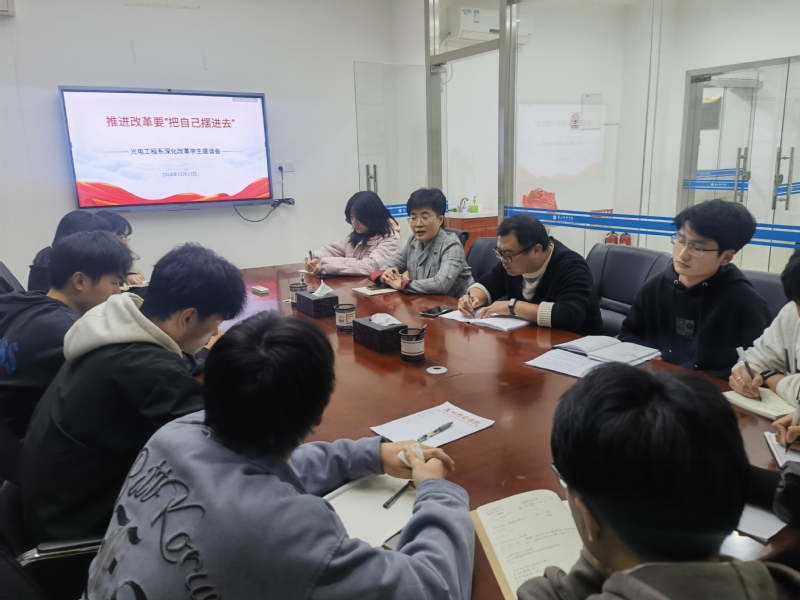 2024年1217晚上光电工程系党总支书记林蕙琼,辅导员柯世池与学院各学生组织负责人、各班班长、团支书等学生代表,在千墅501会议室围绕推进改革要把自己摆进去主题举行了一场深入的座谈会。