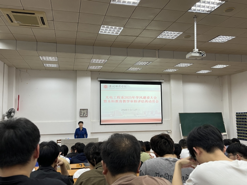 为深入贯彻落实学校本科教育教学审核评估工作部署,进一步强化学风建设,夯实育人根基,3月27日,光电工程系在文科楼A314教室召开学风建设大会暨本科教育教学审核评估再动员会。学院领导班子、专业主任、辅导员、班主任及全体在校学生参加,会议由系党总支书记林蕙琼主持。