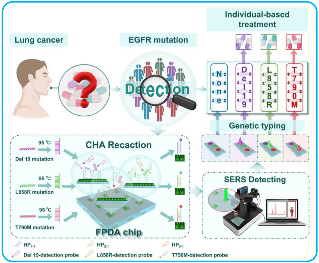 在精准治疗指导方面,提出基于SERS光学传感芯片的肺癌EGFR突变基因分型技术,凭借高分辨率基因变异检测能力,为靶向用药方案提供精准指导,推动肺癌治疗从“经验医学”向“精准医学”转型,该检测方法未来还可拓展至多种基因突变的快速识别(检测方案如图2所示),该成果发表于Laser & Photonics ReviewsIF 10.0),(论文链接:https://doi.org/10.1002/lpor.202570017,团队成员光电工程系范敏副教授为第一作者)。