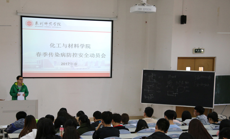 今年以来,全国多省发生人感染H7N9禽流感病例,为预防在校学生感染病毒,化工与材料学院于3月3日中午,召开春季传染病预防动员会议。出席本次会议的有辅导员翁森、陈淑霞、许永贤等老师,以及三委会学生干部和各班班长、副班长、团支书,翁森老师主持会议并发表预防动员。