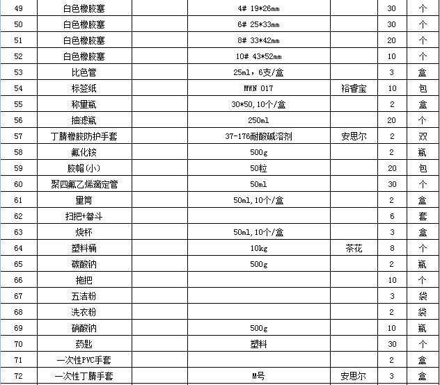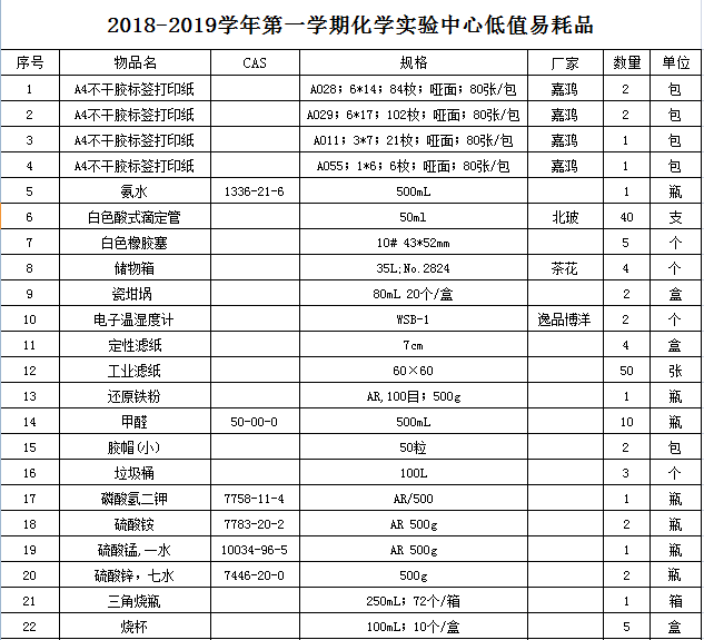 化工与材料学院2018-2019第一学期实验教学低值易耗品等仪器设备