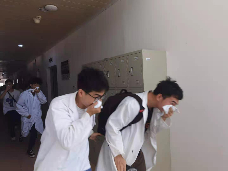 15:30分烟雾弹被点燃,疏散演练正式开始,在警报声中,陈昭情实验楼里的同学们用毛巾掩住口鼻,迅速跑出实验室,并在指挥员和疏散引导员的引导下,按照指定路线有序疏散至陈昭情实验楼六楼门厅前空地,各班清点人数无误后集中到宝龙实验楼前广场。15:35分丰泽区消防大队东海中队消防人员到位,开始灭火和人员抢救,将受伤人员抢救到急救点进行急救。