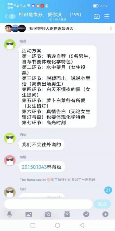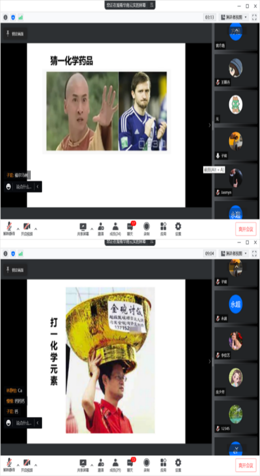 化学系有的老师牵头组织的“相识是缘分爱你没商量”活动,通过“毛遂自荐、水中望月、脱颖而出”等环节,运用化学专用术语,幽默表达了自己的择偶观、婚恋观。有的老师牵头组织的“线上活动猜猜猜”活动,以猜谜的形式,重温了化学药品、元素等知识。有的老师牵头组织的“技艺大杂烩”,通过歌曲、诗词“飞花令”、成语接龙等活动,充分展示了同学们丰富的知识储备。在近两个小时的活动中,师生积极参与、气氛活跃、意犹未尽。活动不但进一步增进师生之间的了解,也缓解了因疫情封控沉闷压抑的氛围。
