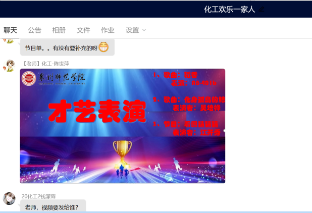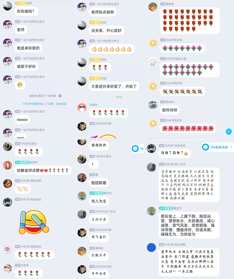 4月2日,化工与材料学院再次全院总动员,四个系的老师利用周末闲暇时间,组织全院学生开展第二期线上交流活动。四个系的老师各显神通、学生各显身手,举办了一场别开生面、精彩纷呈的线上师生互动交流,一扫多日封控的阴霾,共同度过一个愉快的周末。