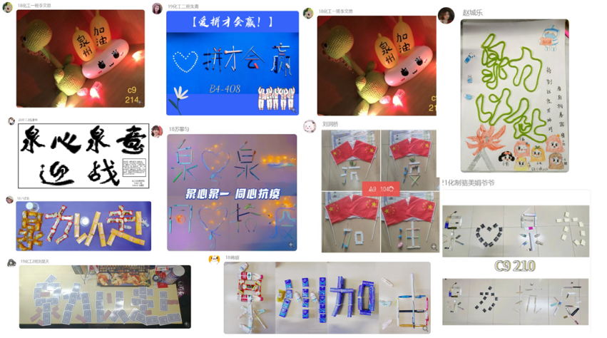 在“‘艺’起抗疫”活动中,同学们以宿舍为单位,利用身边的物件进行艺术创作,以实物、图形摆放“抗疫口号”来表达抗疫的斗志与决心。“爱拼才会赢”“泉力以赴”“泉心泉意”等图形口号创意十足,彰显了同学们卓越的想象力与创造力。在“‘泉’力‘艺’”赴的活动中,同学们通过腾讯会议进行听音辩曲及才艺表演的活动。线上活动欢笑声喧,歌声婉转,驱散着阴霾,静待着夏天,祈愿疫情早日消除!
