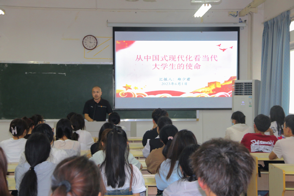 郑少君从中国式现代化的五个特征和九个方面的本质要求,在中国式现代化的道路上当代大学生肩负着的历史使命等两个方面进行授课,鼓励同学们从党的奋斗历程和伟大成就中汲取前进力量。一要追寻真理,争做将个体行为与共同目标相结合的引领者;二要积极投身实践,争做爱国主义和集体主义的传播者;三要倡导绿色环保,争做“绿水青山就是金山银山”的践行者;四要拥抱全球化,争做科技创新的探索者;五要树立底线思维,争做社会主义法律和道德的捍卫者。