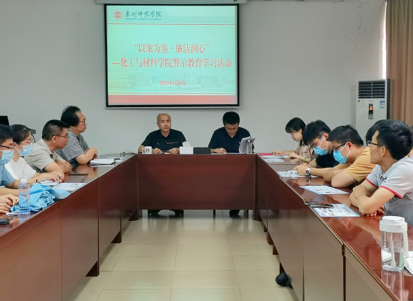 为深入开展学习贯彻习近平新时代中国特色社会主义思想主题教育,落实全面从严治党要求,进一步强化学院教职工廉洁自律意识,牢固树立“不想腐”的思想自觉,化工与材料学院于6月8日召开“以案为鉴·廉洁润心”警示教育学习活动。学院党委书记郑少君,副院长卓东贤、李国清,党委副书记兼纪委书记林琦芳,全体教职工参加。