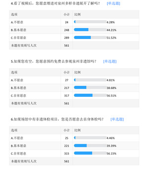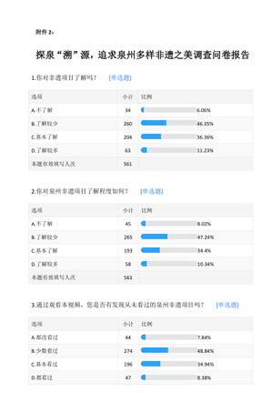 “溯泉”实践队视频制作完成后投放到我院各班级,并通过设计、发放调查问卷的方式分析该视频的宣传效果。“溯泉”实践队通过回收561份问卷分析发现,在观看该宣传视频后已有很多学生表示在开学后将会走进泉州非物质文化遗产馆、了解和宣传泉州的非遗项目。可见“溯泉”实践队制作的泉州非物质文化遗产馆宣传片,对勉励青年学子做新时代泉州非遗文化的传承者、传播者与讲好中国故事起到积极的促进作用。