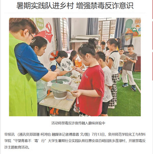 为积极响应“青春为中国式现代化挺膺担当”主题“三下乡”社会实践号召,增强青少年的禁毒反诈意识,化工与材料学院“守望青春不‘毒’行”实践队前往泉州市青少年社会保护中心、泉州市丰泽区林则徐禁毒教育基地、泉州市惠安县百崎回族乡台商投资区莲埭村委会等地开展一系列暑期社会实践活动。此次社会实践先后被中青校园、泉州东南早报等媒体报道,有效提升了社会实践活动的影响力。