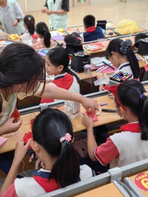 在制作彩色风铃环节,队员们先拆解“裁剪、染色、串挂”三大核心技法,再以“塑料瓶除了扔掉,还能变成什么”的提问引导孩子发散思考,让孩子们直观理解“废弃物是放错地方的资源”。“‘塑’造繁花”环节更具巧思,在队员们的悉心指导下,孩子们将彩色塑料袋,通过剪、拧、扎等简单手法创意搭配,亲手打造出一朵朵形态各异、永不凋零的“塑料繁花”。在指尖创作的过程中,孩子们既锻炼了动手能力、创新思维与问题解决能力,更在动手实践中深化环保与节约意识,将“变废为宝”的理念自然内化为日常习惯;同时在发现美、创造美的过程里,真切感受到艺术与生活交融的独特魅力。