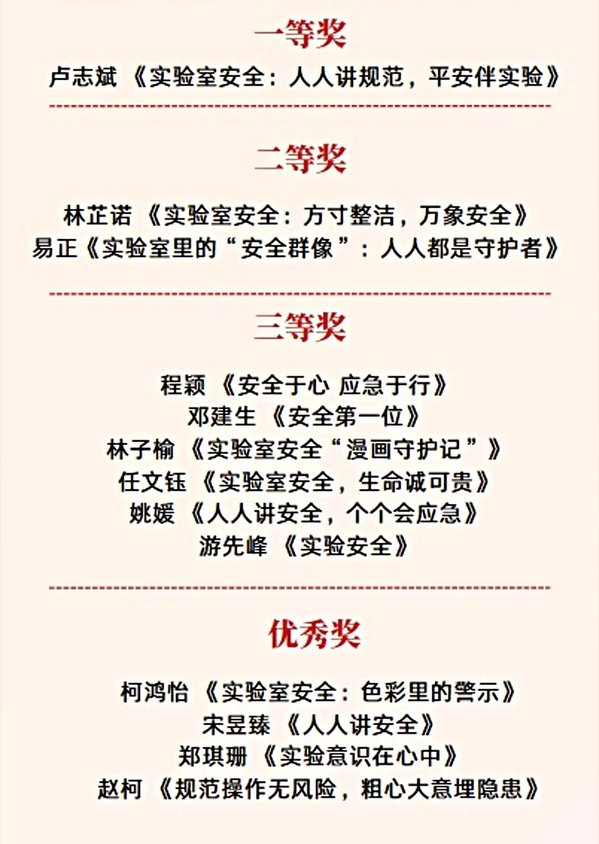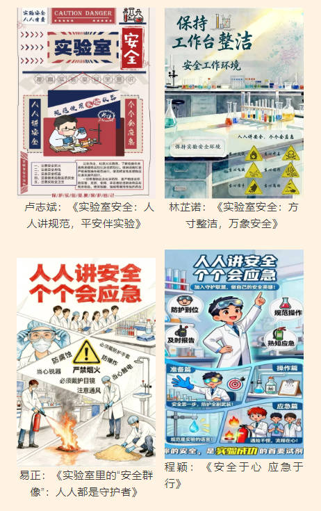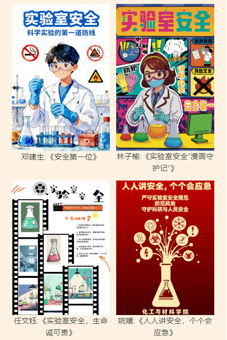 一张张海报,既是实验室安全知识的生动传播,更是化工与材料学院学子创意与责任的完美融合。期望以此次活动为契机,同学们能将实验室安全理念内化于心、外化于行,让安全成为科研路上的永恒底色,为学科探索筑牢坚实根基。