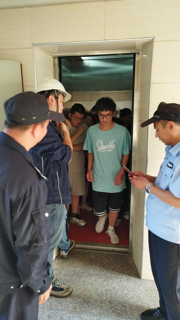 在模拟电梯不平层困人的场景中,学生代表被“困”在电梯内,工作人员按下电梯内的一键报警按钮,向学校监控室求助。接到报警后,接线员立刻通知电梯安全管理员,迅速启动应急预案,通知电梯维保人员赶赴现场进行救援。同时,保安人员和楼管员也迅速到达现场,维护秩序,确保其他人员远离危险区域。电梯维保人员到场迅速解救被困人员,排除电梯故障。