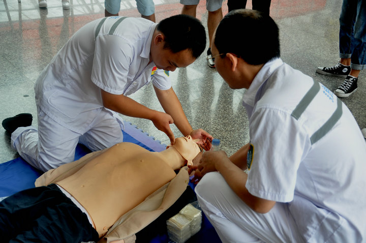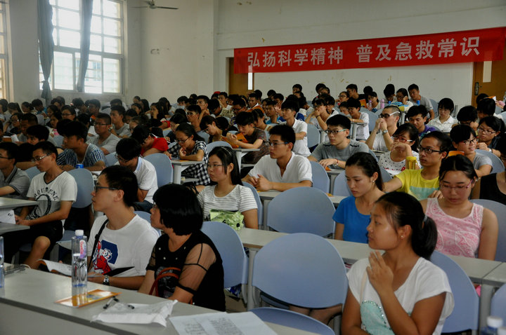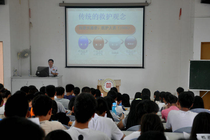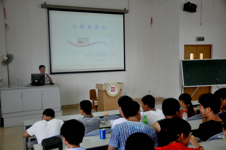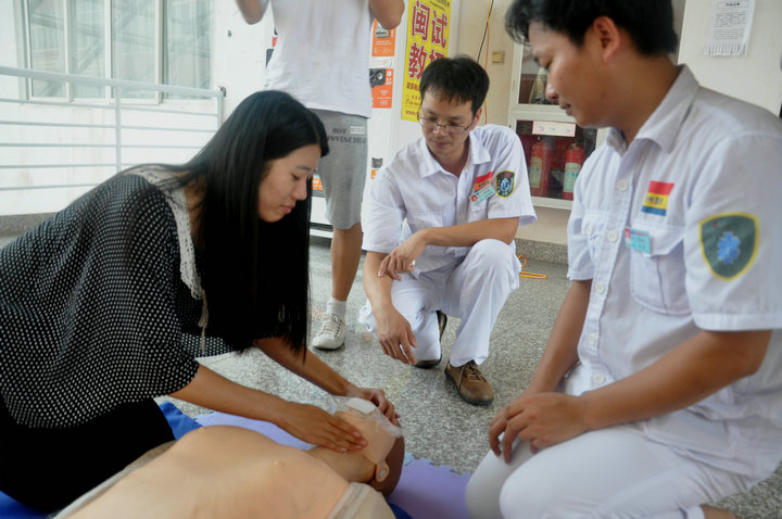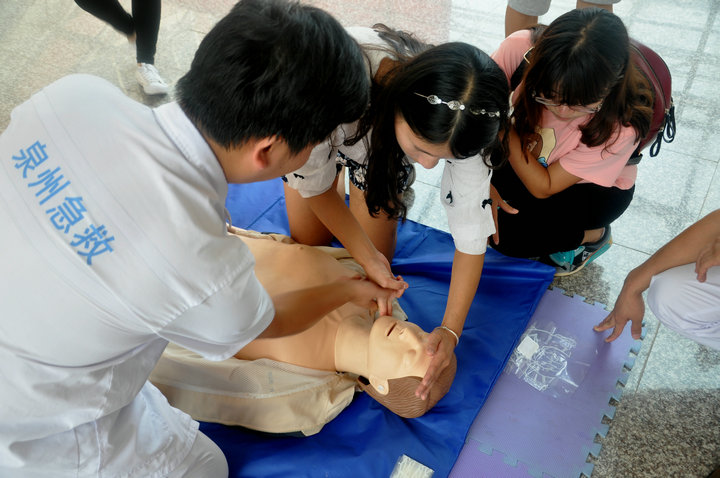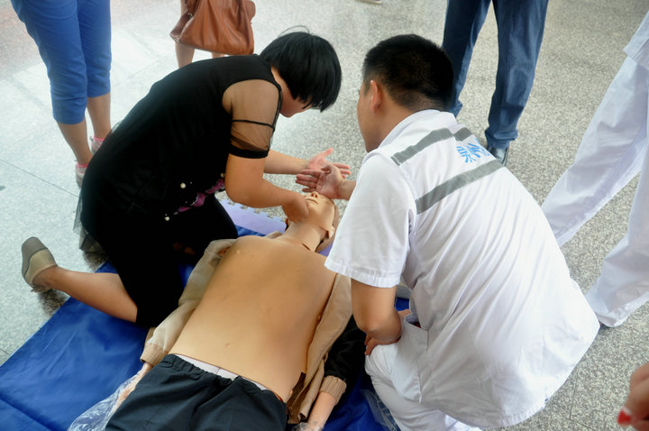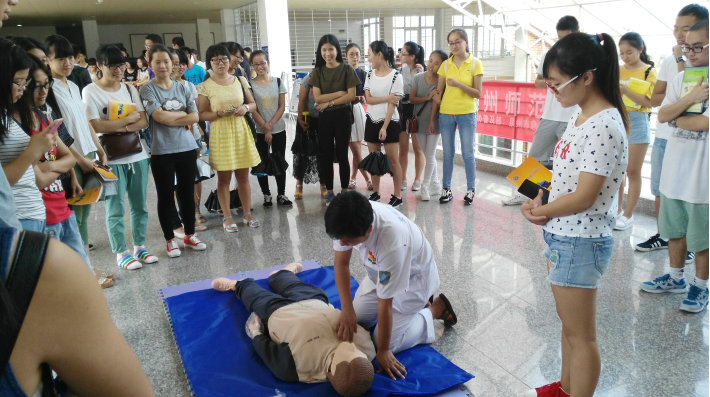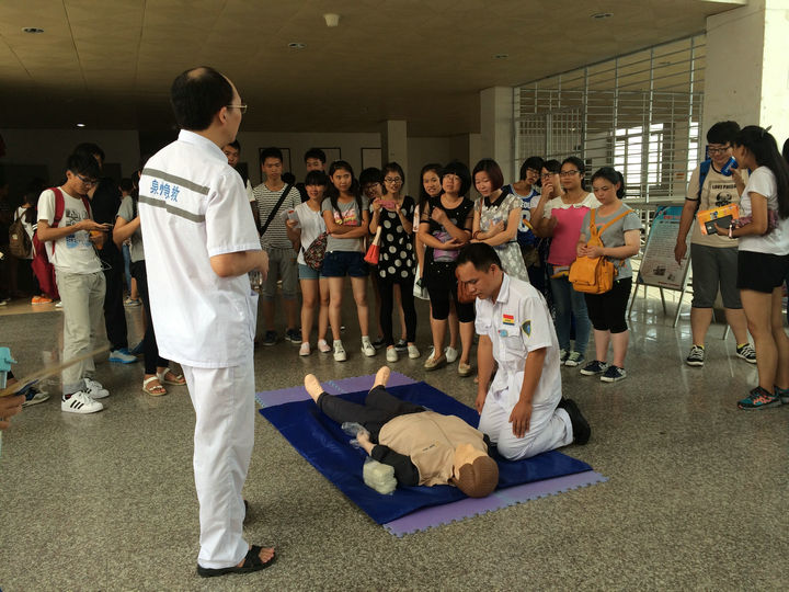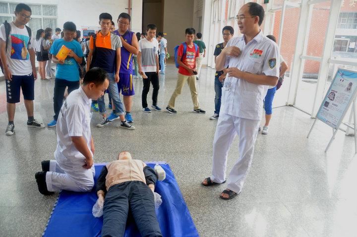 在普及初级救护培训环节,陈医生为大家讲解了救护的新概念、徒手心肺复苏术等方面的知识。陈医生用人类猝死率,发达国家紧急施救的时间等真实数字,为大家讲述了学会急救的必要性。他向在座的学生发出号召,每一个人都应该学习自救、互救知识,不能单纯等待救护人员赶来急救!他还为在座的学生介绍了徒手心肺复苏术的定义和操作程序。 在室外演示环节,学生共分为三组,市急救中心的医生现场手把手教授学生如何进行心肺复苏,在场师生认真学习并积极踊跃参与对人体模型进行心肺复苏。 本次急救常识技能培训活动的举行,加强了师生的自救互救意识,培养了师生在紧急意外发生时的应急能力。以本次培训讲座为契机,师生代表们将把自己所学到的相关知识向周边的同事、学生们推广普及,唤起更多人对校园安全的重视。(学院记者 祝云芳) 【红十字生命体验】化生学院举办急救常识技能培训_CMS