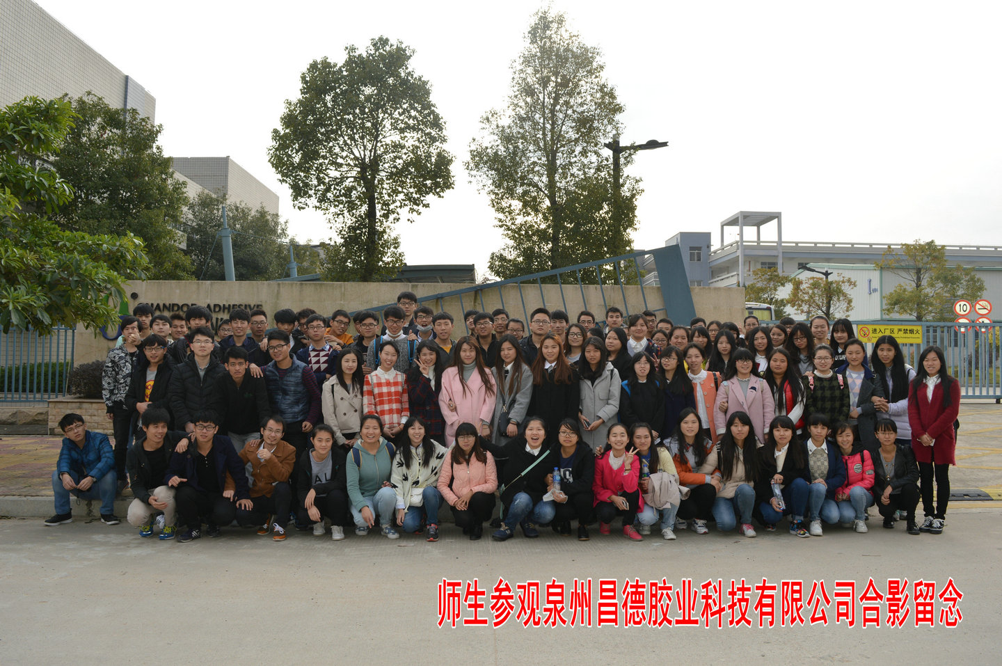 在昌德胶业科技有限公司,同学们参观了热熔胶、环氧胶、丙烯酸、厌氧胶、瞬干胶生成线和产品研发中心。公司人力资源部总监黄晓旭和工程技术人员就同学们所关心的公司实习要求和待遇、胶水生产过程的技术进行了详细的讲解。
