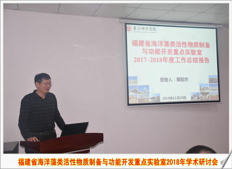 24日,“福建省海洋藻类活性物质制备与功能开发重点实验室”2018年学术研讨会在宝龙实验楼449会议室正式召开。英国威廉希尔公司官网科研处处长戴聪杰教授代表学校表达了对学院发展和重点实验室建设的支持。泉州市海洋渔业局黄前程副局长出席了本次会议,并为学院重点实验室建设和发展提供了各方面支持,同时大力促进了地方校企合作。重点实验室负责人戴聪杰教授对“福建省海洋藻类活性物质制备与功能开发重点实验室”进行了工作总结及来年计划的汇报。福建农林大学副校长郑宝东教授作了题为“海藻高值化加工技术的研究与开发”的专题报告,对海藻深加工技术进行了简要介绍,并对低熔点琼脂制备、海藻新型糖类功效因子结构特征及功能解析等内容进行了分享。在报告结尾,郑副校长也对重点实验室的建设提出了“必须以学科为支撑,争取申请硕士点,可先申请专业硕士点”等宝贵建议。