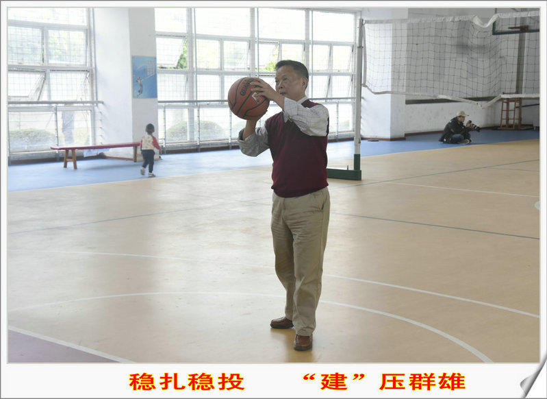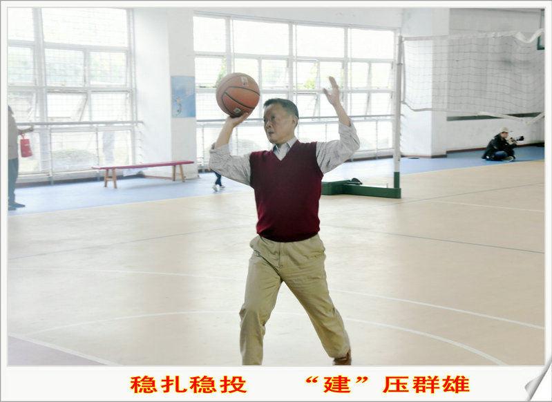 定点投篮比赛分为两轮,第一轮采取一人十球制,一球一分,多者获胜,取得相同成绩的老师进入第二轮争夺最终名次。赛前,袁建军进行了充分的热身运动,并试投了几次球。比赛开始后,袁建军缓缓的走入场地,只见他膝盖微屈,双手握球,瞄准球框,目不转睛。经过几次的失败与胜利,袁建军渐渐找到了方法,稳扎稳打,目不斜视,场下欢呼声不断,最后袁建军以并列5分进入第二轮。第二轮比赛中,建设性的一球,让他取得了教工组男子定点投篮第三名的佳绩,也为海洋与食品学院增光添彩。