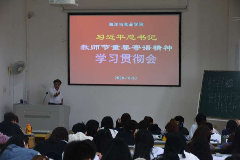 10月29日,海洋与食品学院全体教职工在宝龙楼430会议室学习习近平总书记教师节重要寄语精神。本次学习贯彻会由海洋与食品学院党委书记蔡英卿教授主持。