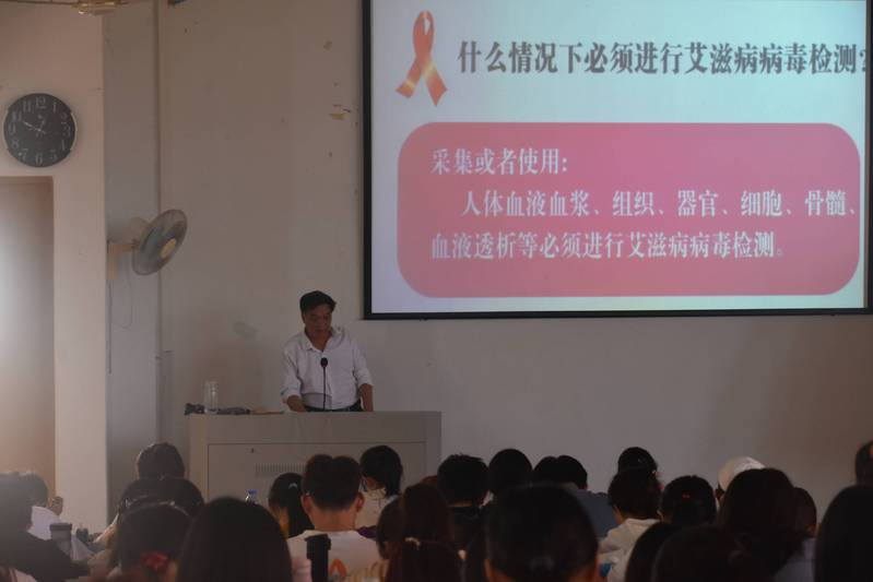 艾滋病全称是“获得性免疫缺陷综合征”,缩写为AIDS,它是由艾滋病病毒即人类免疫缺陷病毒(HIV)引起的一种病死率极高的恶性传染病。随后,蔡英卿向同学们介绍艾滋病的病发阶段、疾病症状、治疗和控制方法、传播途径、检测方法、能否治愈等知识。蔡英卿指出,2020年12月1日是在第33个世界艾滋病日,要“携手防疫抗艾,共担健康责任”,要学习了解关于防艾滋的知识,增强个人防艾的使命感和责任感,提升防艾、抗艾的能力。