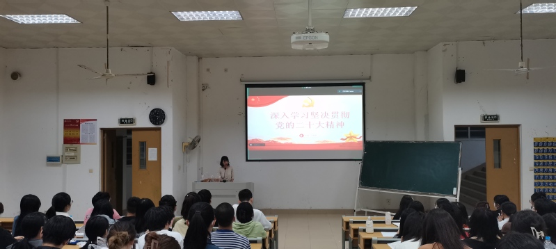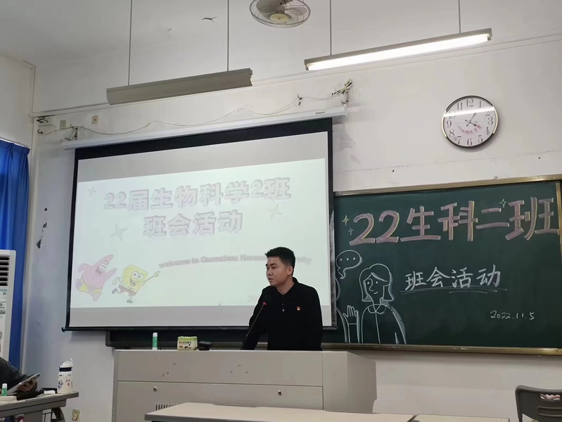 11月4日,学院团干部、辅导员乐生煊为2022级生科2班的同学开展“学习二十大,永远跟党走”主题教育班会,带领同学们学习党的二十大精神的重大意义及二十大关于党的建设新论断新部署新要求。班会还设置了合唱环节,在《我和我的祖国》的旋律中,同学们的思想和精神再一次受到洗礼。班会最后,乐生煊寄语同学们:“要立志做有理想、敢担当、能吃苦、肯奋斗的新时代好青年,以实际行动践行‘请党放心 强国有我’的誓言”。