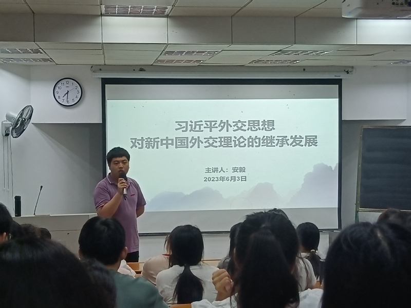 学院团干部、辅导员安毅在学习贯彻习近平新时代中国特色社会主义思想主题教育读书班暨第10期入党积极分子培训班上为同学们上题为《习近平外交思想对新中国外交理论的继承发展》的党课。党课以新中国外交理论发展历史为线索,围绕新中国在各发展阶段的外交理论成果展开论述,从外交思想史的视角看中国综合国力和国际社会地位的逐步提升,帮助同学们进一步理解习近平外交思想的相关内容,进而从国际视野解读习近平新时代中国特色社会主义思想,引导同学们领略伟人智慧,继承红色基因,坚定理想信念,发扬实践精神。