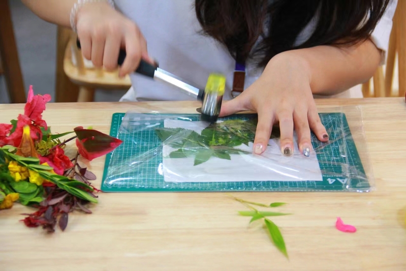 接下来的“植物拓染”环节,展示了中国古老而独特的传统印染技艺,这也是我国非遗技艺的瑰宝之一。同学们热情高涨,纷纷选取3-4种不同的植物,以“我们的清明心语”为创作主题,巧妙地进行构图、固定,再通过精心的敲拓染工艺,创作出一幅幅春意盎然的清明心语图。在“清明点茶”环节,同学们学习了烫盏、调膏、七汤点茶、茶百戏等技艺。点好茶后,他们纷纷在便利贴上写下自己的“清明心语”,字里行间流露出对亲人的深情缅怀,对烈士的崇高敬意,以及对未来生活的美好憧憬。