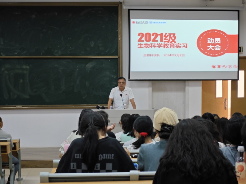 7月2日,海洋与食品学院在理工320教室召开2021级生物科学专业教育实习动员大会。学院党政领导、生物科学系主任、副主任、实习带队老师、学院党政办、学工办、教学科研办负责人以及21级生物科学专业全体同学参加了此次动员会。会议由21级生物科学专业辅导员王哲芳主持。
