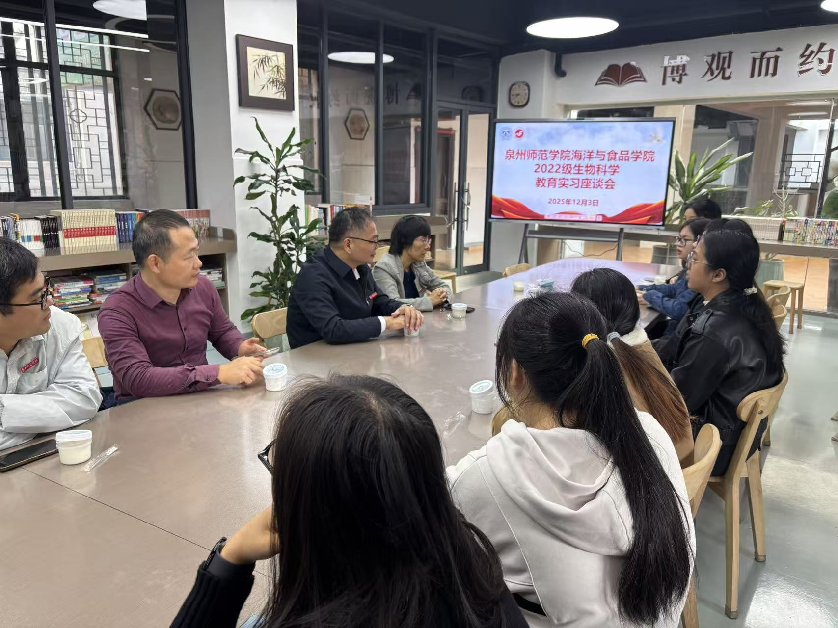 12月3日,党委书记蔡志荣、生物科学系主任陈细香、教研室负责人傅淑以及带队老师桑庆亮等一行4人,专程前往泉州实验中学滨江校区及台商校区实习点,看望在此实习的2022级生物科学专业实习生们,以座谈交流传递学院关怀,为大家的实习之路鼓劲加油。滨江校区指导老师王茗心、台商校区副校长王娟娟、教研组组长张美珍、高一年段长惠永杰、李秀兰以及高一生物组组长陈琳婧等热情接待并参加座谈。