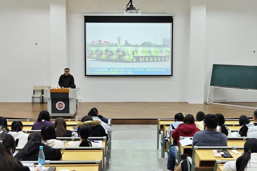 12月4日,宣传员傅厚毓老师围绕‘青春许国,强国有我’主题,为25级生科、海技专业的同学们授课。他从历史纵深与现实关切两个维度,深刻阐释了国防建设与爱国主义精神的时代意义。他强调,和平环境来之不易,必须居安思危。他号召全体同学坚定理想信念,听党话、跟党走,将专业学习与国家海洋强国战略相结合,以扎实学识和赤诚情怀践行新时代青年的责任担当。