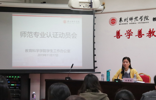 为迎接师范类专业认证,11月17日下午,教育科学学院在特教大楼召开师范类专业认证动员大会。教育科学学院学工办副主任、团委副书记林翠玲、团委老师张甲玉、杨碧敏、陈宸、许龙权、林美玲、吴雅文参加本次动员大会。