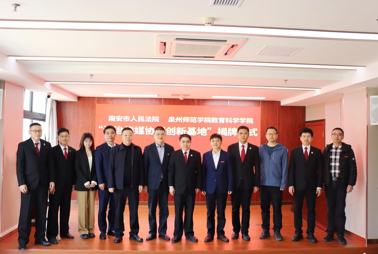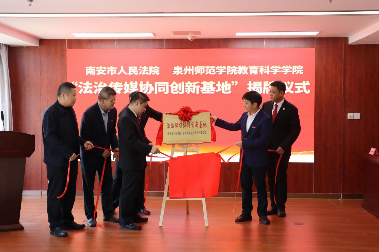 教育科学学院院长雷培梁、党委书记陈一祥,南安法院党组书记、院长许良才,泉州中院办公室主任朱毅达,南安市委宣传部副部长潘高鹏一同为“法治传媒协同创新基地”揭牌。
