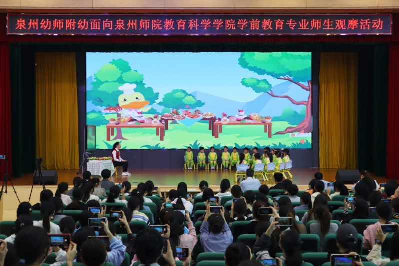 本次课程实践得到了泉州幼师附属幼儿园领导、老师的大力支持。学园为我院师生配备了优质师资力量,开放了21个班级和一场音乐集体活动《去美食节的小老鼠》,围绕《幼儿园教育活动的设计与指导》《幼儿园班级管理》《学前儿童行为观察与分析》等专业课程展开观摩活动。学生分散到各个班级,观摩各年龄段幼儿的生活活动、集体活动、区域活动,通过参与式观察,了解幼儿的早操、盥洗、点心和集体教学等活动的设计与指导以及班级常规管理等,在活动中与幼儿近距离接触,与幼儿互动、对话,观察幼儿的行为,了解幼儿的心理与行为发展特点。