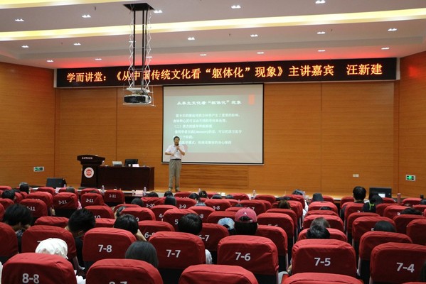 汪教授首先对躯体化(somatization)概念进行解释,并详细介绍了躯体化概念的演化。躯体化是指人们在心理产生不适时,不是以心理化的方式呈现,而是以生动多变的躯体症状呈现,如头昏、头痛、胸闷、慢性疼痛、腹胀等等。在治疗专家们为解决躯体化问题而努力的时候,不同文化背景下关于躯体化报告率的差异引起人们的关注,许多流行病学调查显示,中国社会躯体化的报告率远高于西方。一些跨文化研究表明,西方抑郁症发病率高于非西方国家,同时西方患者较多以心理和精神范畴的名词来表达疾病体验。基于此,汪教授从中国本土文化出发去理解躯体化现象,从中国传统身体观和疾病观看躯体化问题,倾向于得出另一种不同的理解:中国人在表达疾病体验时的高躯体化,是一种文化适恰的诉说方式。讲座结束后,参会教师和学生根据自身工作或学习中的问题与汪教授进行了热烈讨论。